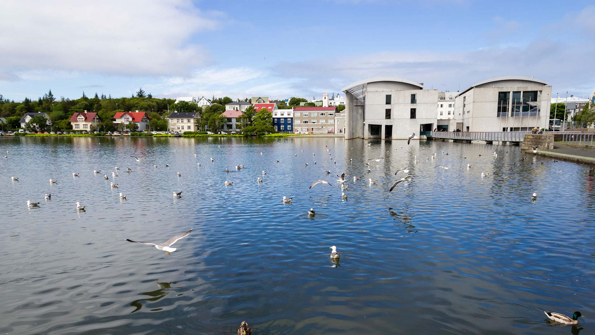Taking up a prominent location at the North end of Reykjavík’s central pond, Tjörnin, Reykjavík City Hall is a modern concrete and glass building that flows seamlessly with its surroundings. The building is open to visitors, accessible via a bridge over the pond, around which ducks frolic and eagerly await passersby to toss them some bread.