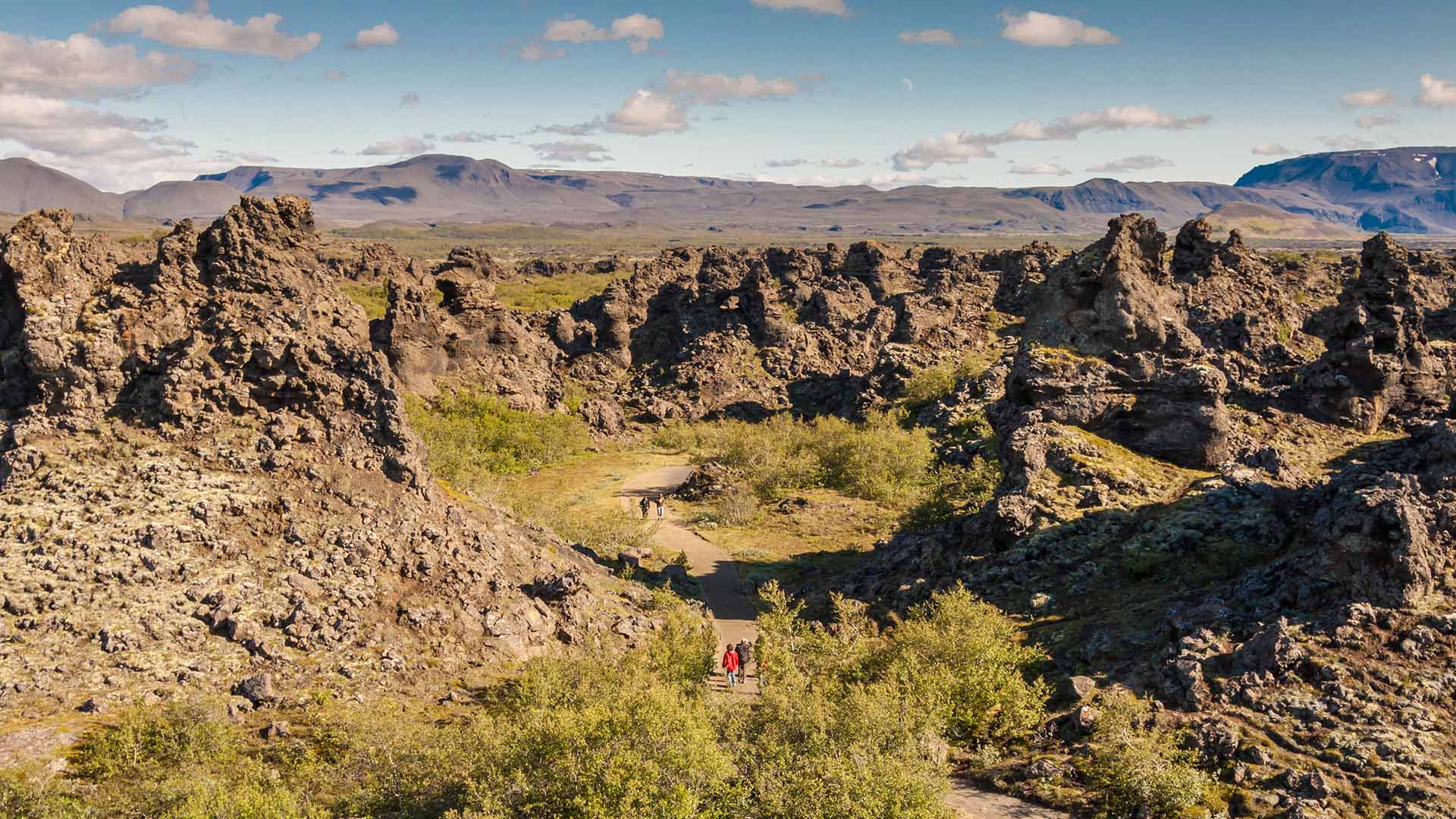Dimmuborgir is a magnificent lava landscape with extraordinary formations, columns, caves, and arches created by the flow of a lava lake over a marshy area some 2300 years ago. As the hot lava flowed over the marsh, the water in the ground began to boil, and the rising vapours created the areas’s distinct lava pillars. The expansive field is marked with various walking paths to explore, some estimated to take 30 minutes to navigate, and other demanding hours to complete.