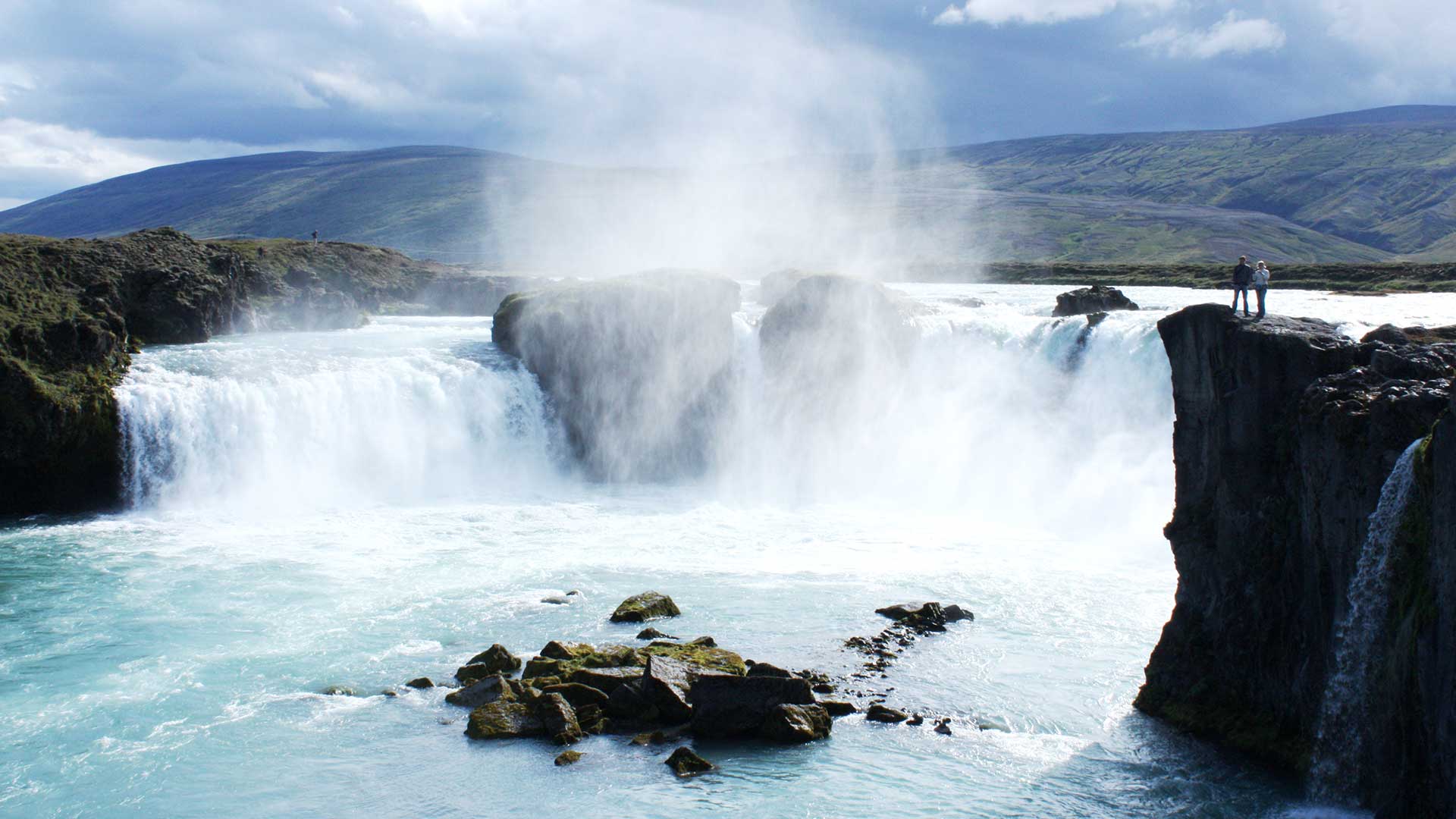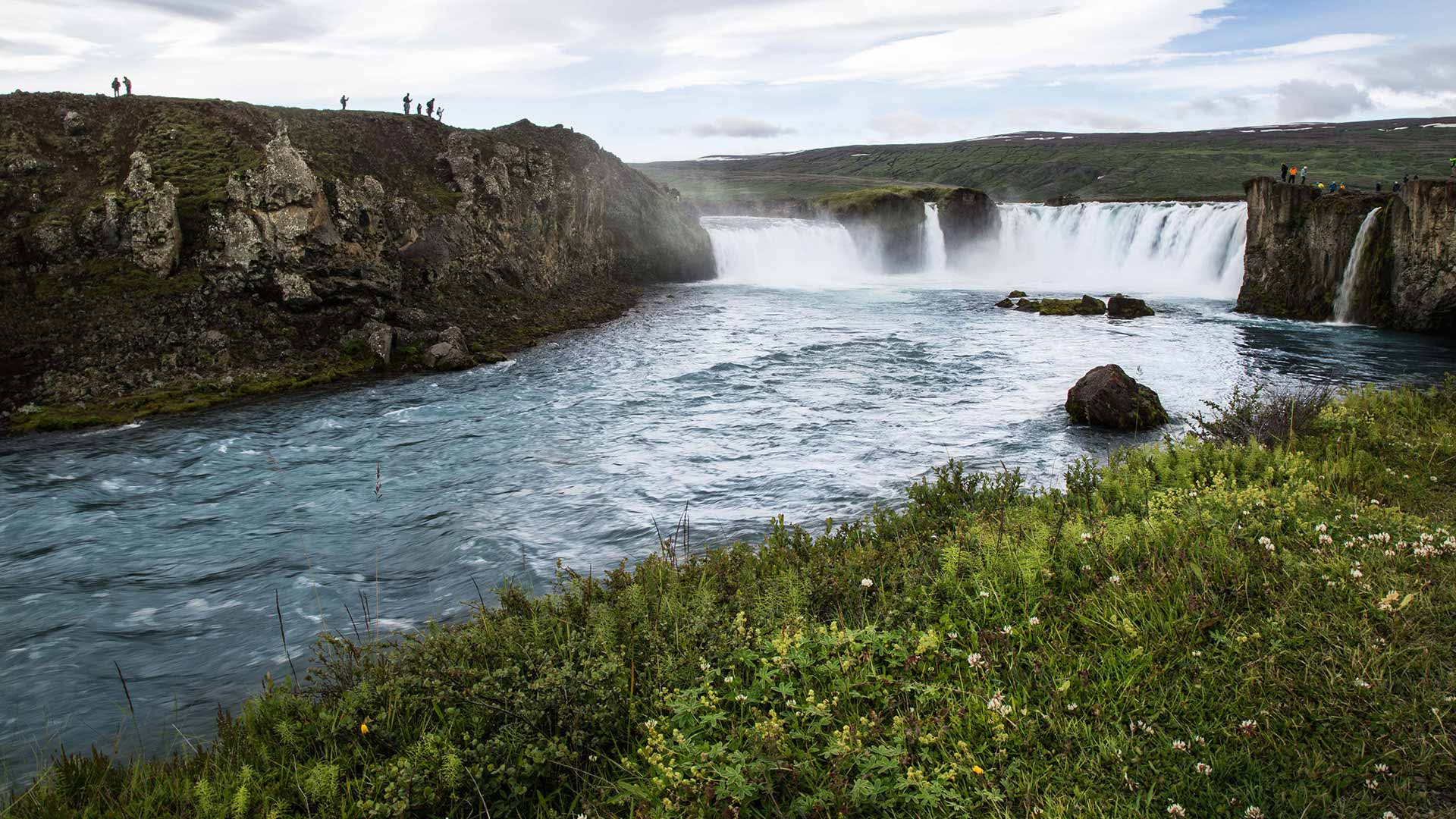 Goðafoss, ("Waterfall of the Gods“) is among the most beautiful falls in the country. Though it is not very tall, the cascade is divided into two horseshoe-shaped falls, making it unique among Icelandic waterfalls. Not far above the falls the river Skjálfandafljót divides in two, forming the island Hrútey.