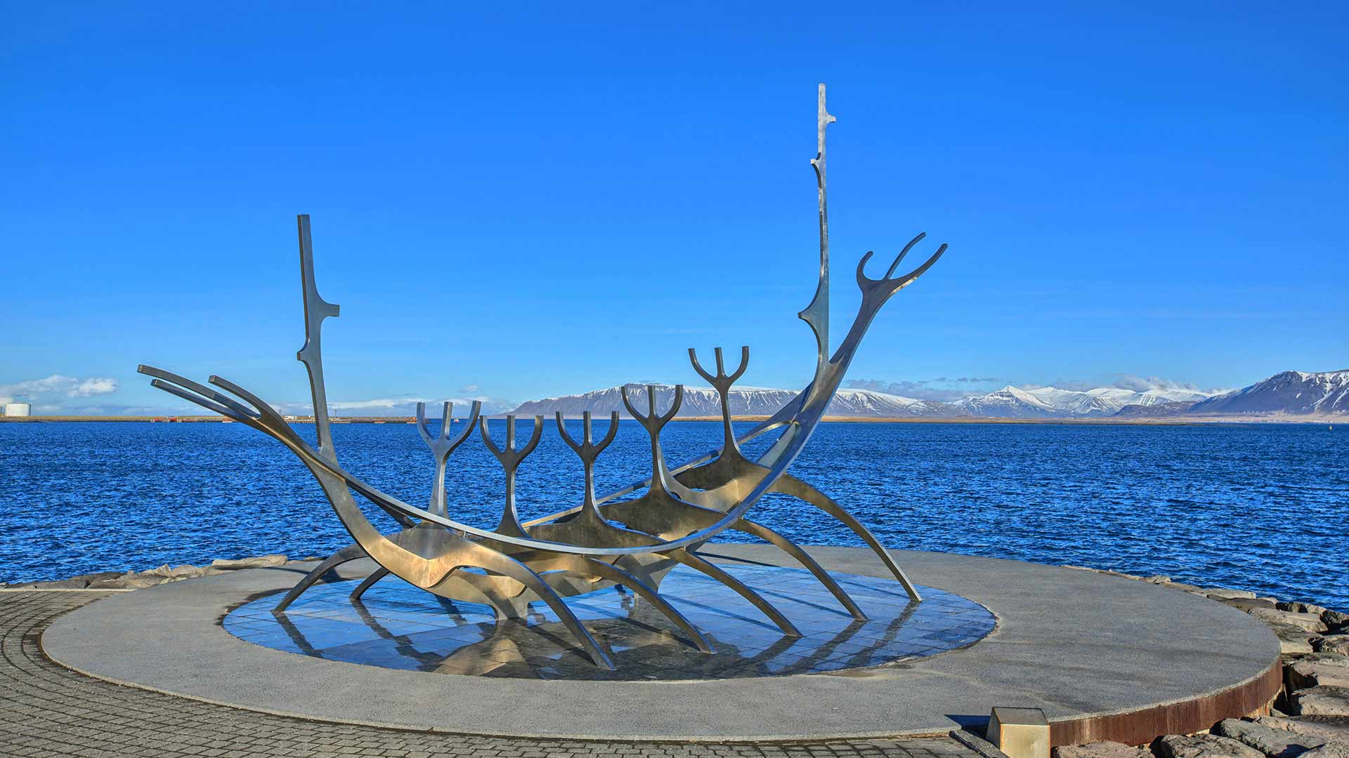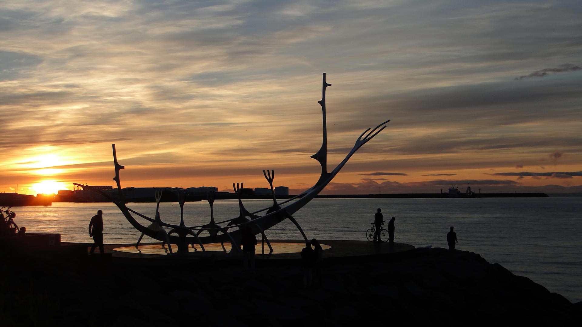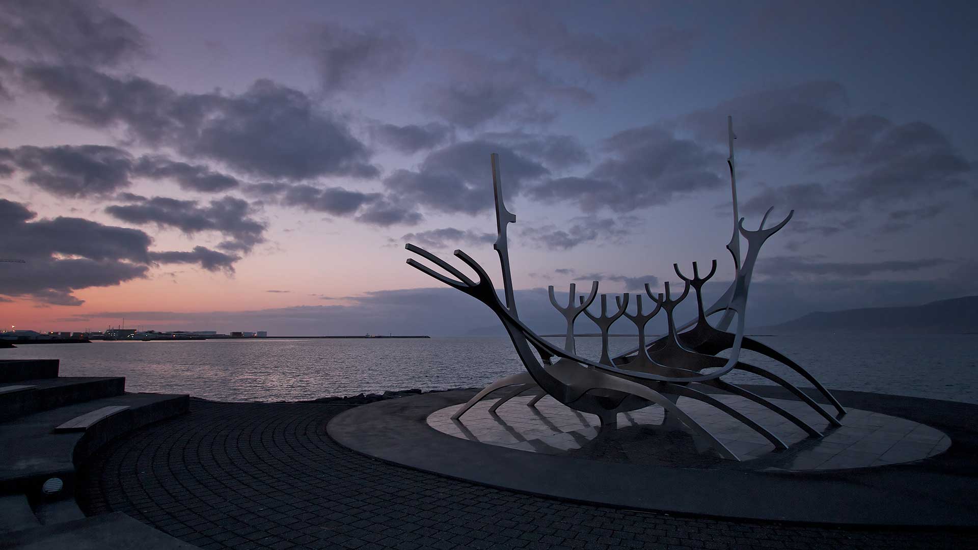Sólfarið, or The Sun Voyager, is an iconic statue along the seaside of Reykjavík unveiled to mark the 200th birthday of the city of Reykjavík on August 18, 1990. Designed by artist Jón Gunnar, the statue is built of stainless steel and is the artist’s interpretation of a dreamboat and ode to the sun. Jón’s intention was to give the city something that inspired dreams and imagination and symbolizes light and hope. It is not, as some think, a Viking ship.