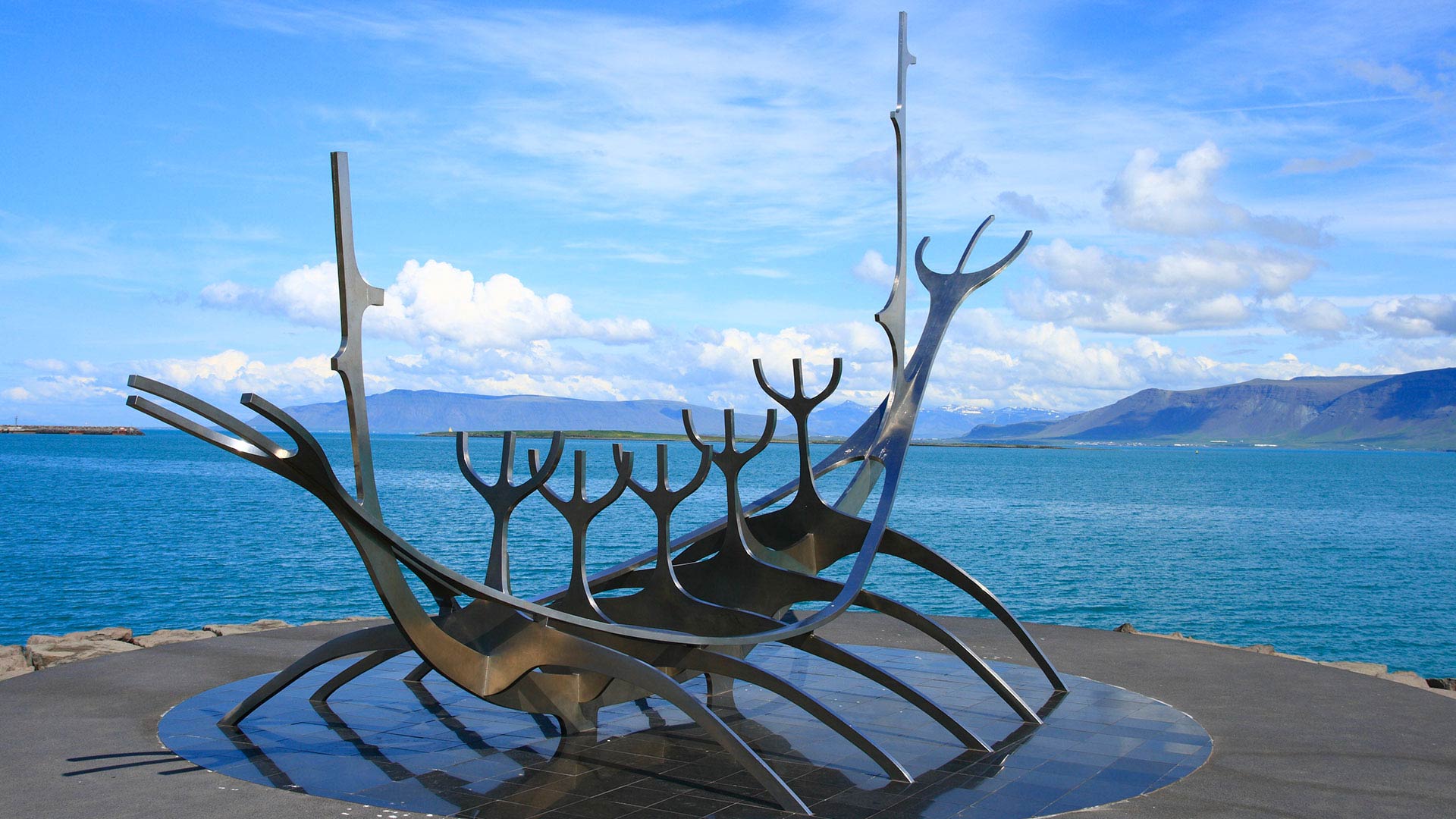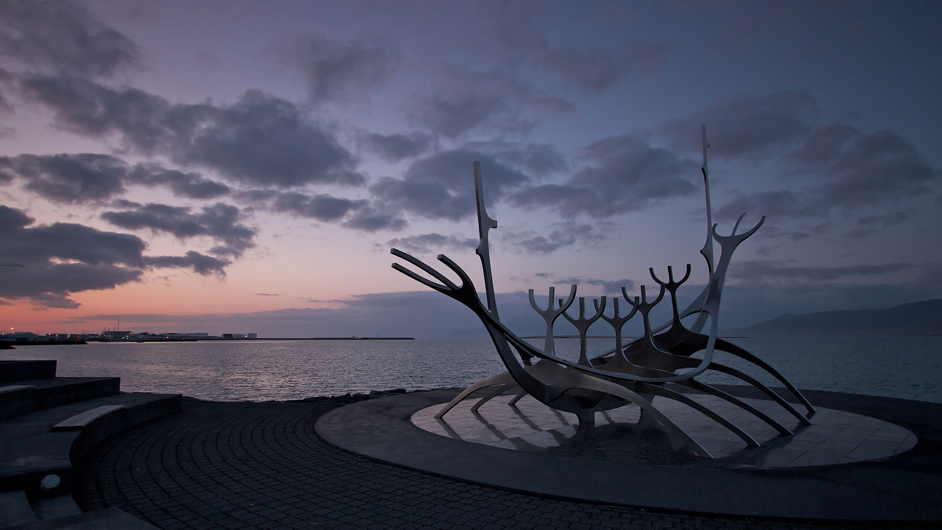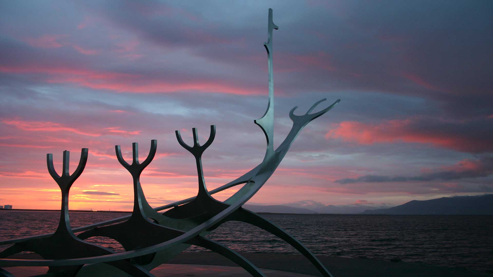 Sólfarið, or The Sun Voyager, is an iconic statue along the seaside of Reykjavík unveiled to mark the 200th birthday of the city of Reykjavík on August 18, 1990. Designed by artist Jón Gunnar, the statue is built of stainless steel and is the artist’s interpretation of a dreamboat and ode to the sun. Jón’s intention was to give the city something that inspired dreams and imagination and symbolizes light and hope. It is not, as some think, a Viking ship.