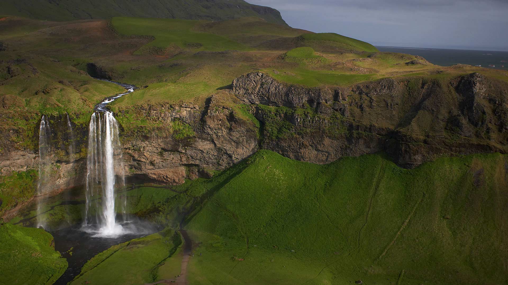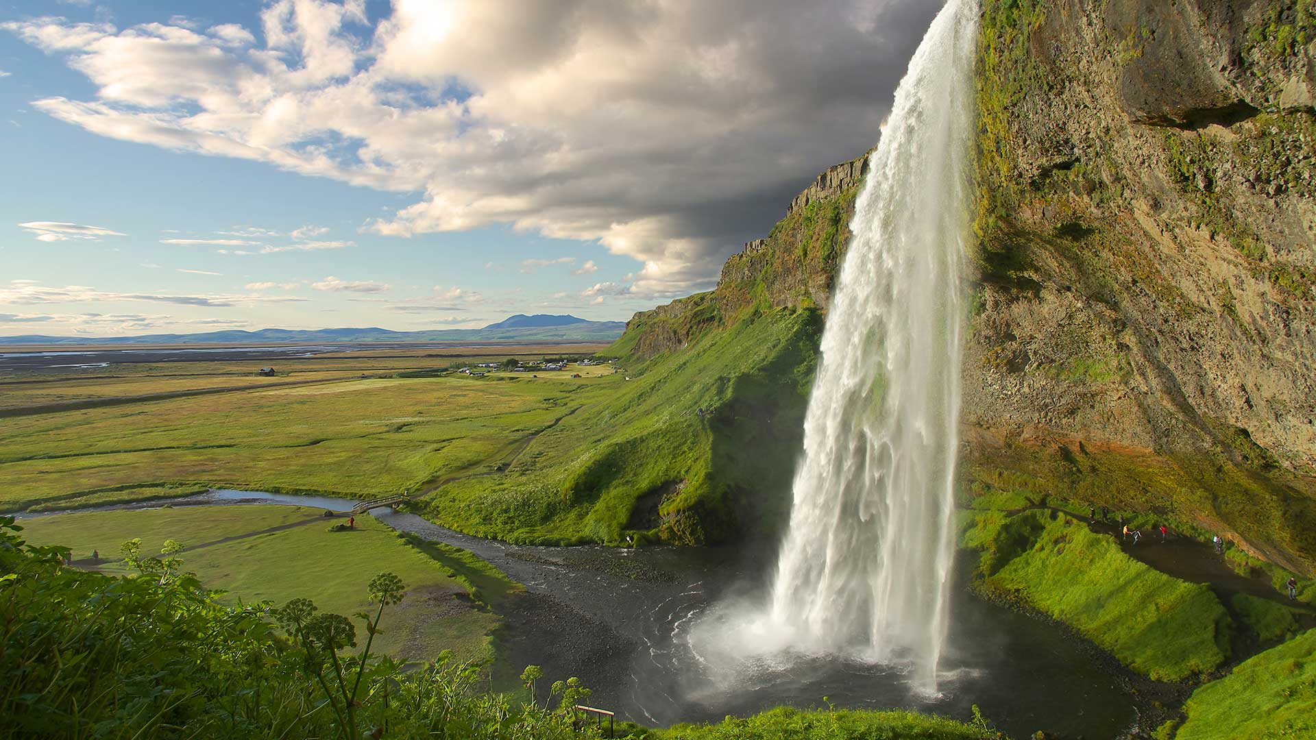 One of Iceland’s most visited waterfalls, after Gullfoss, Seljalandsfoss is situated along the Seljalandsá river where the waterway plummets 40 metres over a cliff face. Seljalandsfoss is unique among waterfalls, as the shape of the cliff over which it falls allows visitors to walk behind the chute via a footpath at the base of the falls.