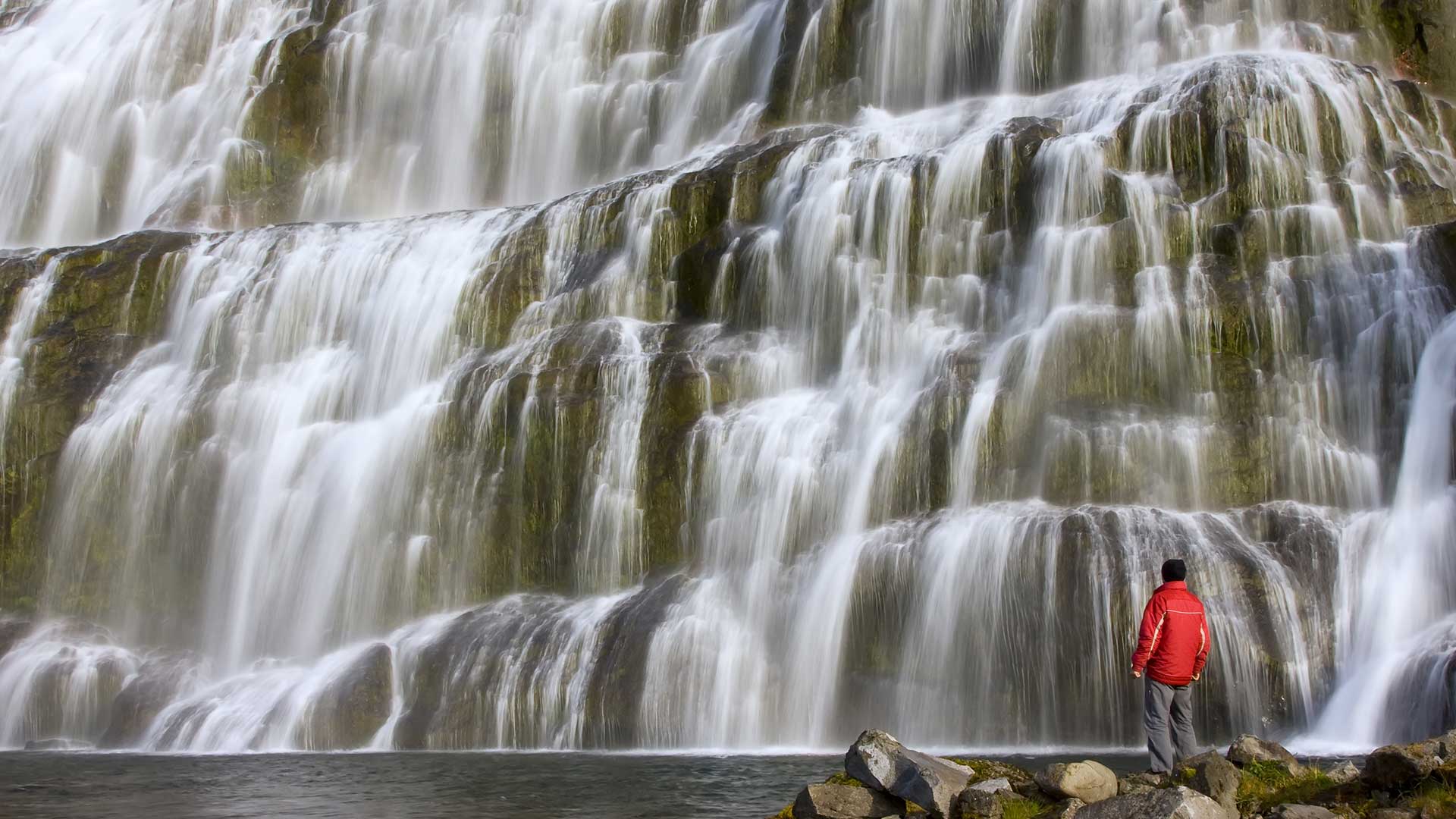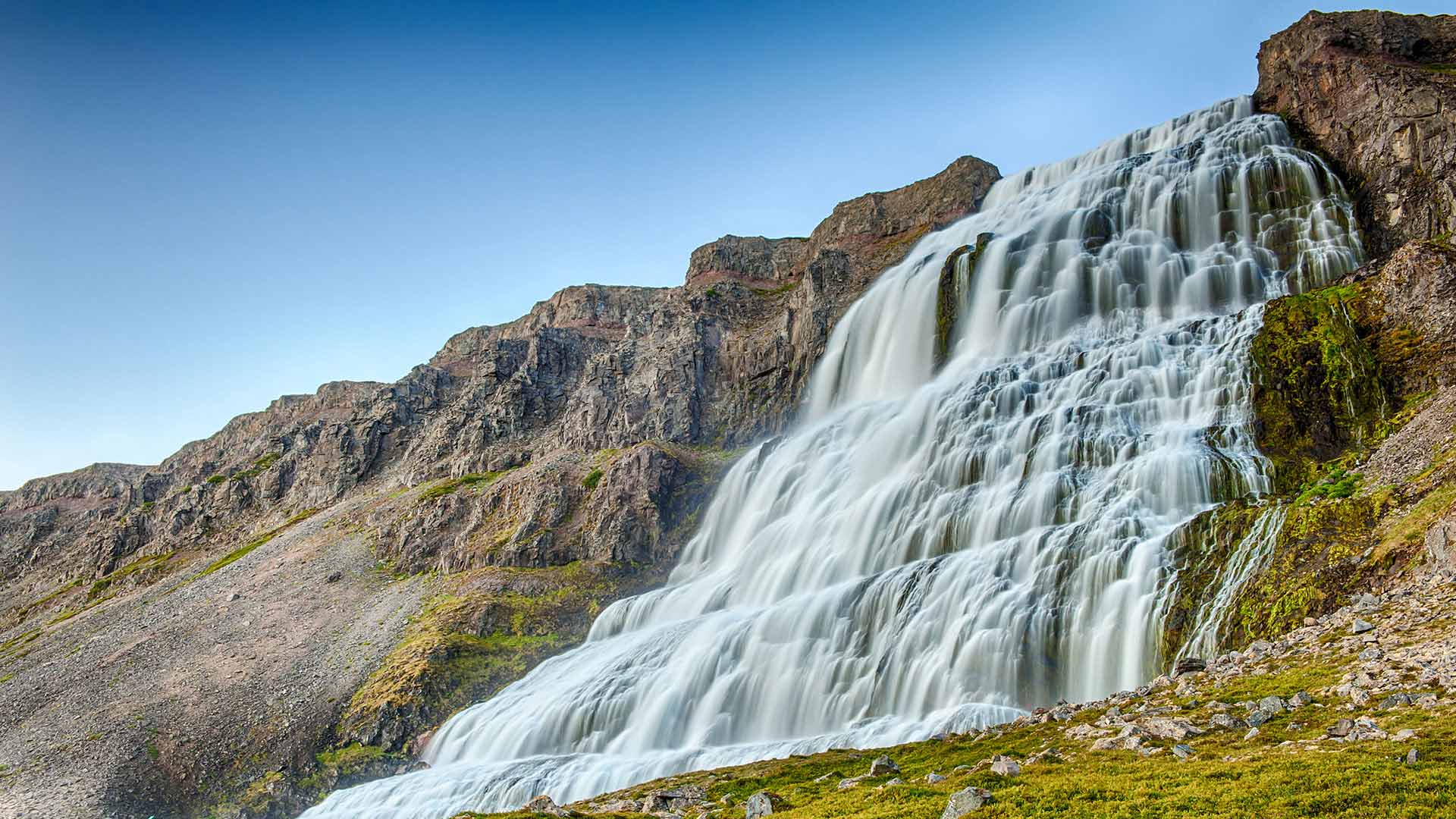 The impressive Dynjandi waterfall is located at the base of the Arnarfjörður fjord. Often likened to a bridal veil, the falls are 30 metres wide at the highest point and 60 metres wide at its lowest point. They stand 100 metres tall.