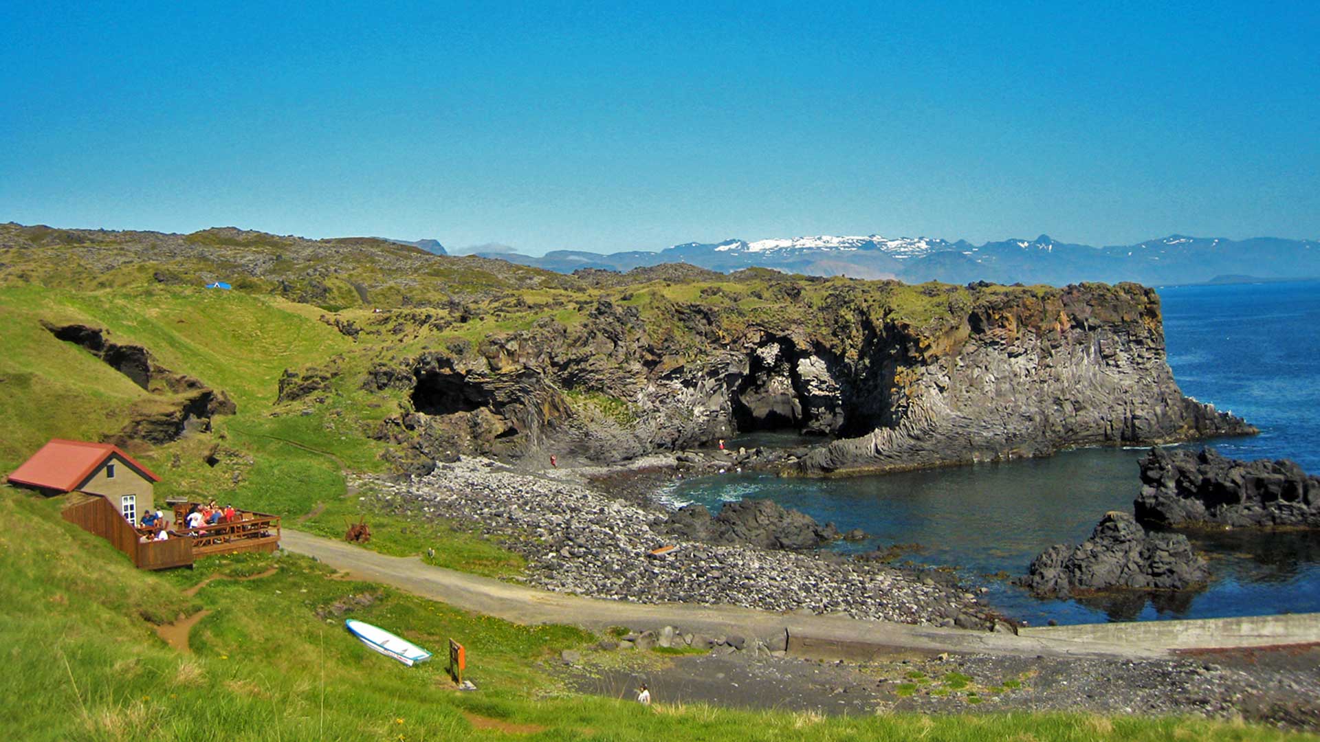 Hellnar is a fishing village nestling on a dramatic coastline of spectacular and beautiful cliffs which rise directly from the ocean. There are also some unique rock formations in the area. The cave Baðstofa is particularly famous for the eerie light inside it. Hellnar is the birthplace of Guðríður Þorbjarnardóttir, the wife of Þorfinnur Karlsefni, a legendary Icelandic explorer.