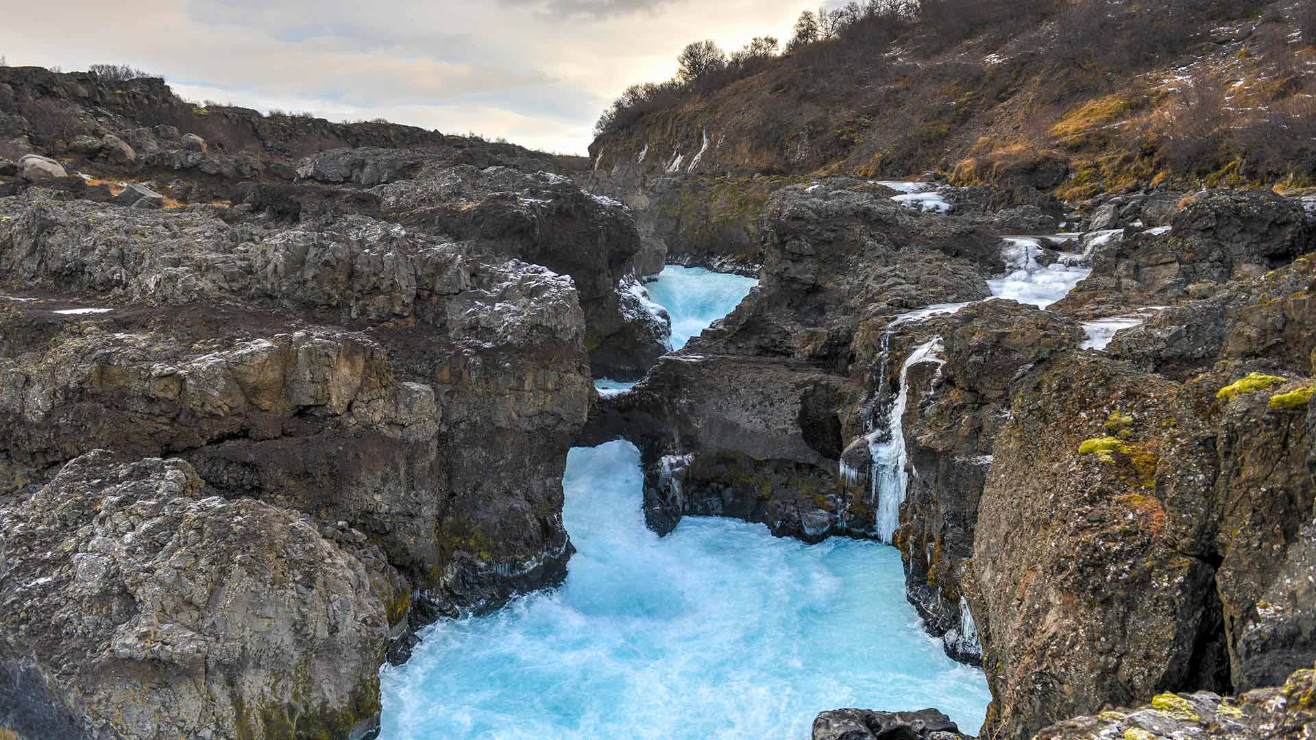 Another waterfall beside Hraunfossar is Barnafoss, which is more like a series of rapids caused by the water of Hvitá entering a narrow passage. Barnafoss means “Child Falls” and legend has it that one day two boys were left home while their parents went to church, but they got bored and decide to follow. When taking a shortcut, the two boys tried crossing the falls over a natural stone bridge but fell in and drowned. The mother of the boys cursed the bridge and shortly after it was destroyed by an earthquake.