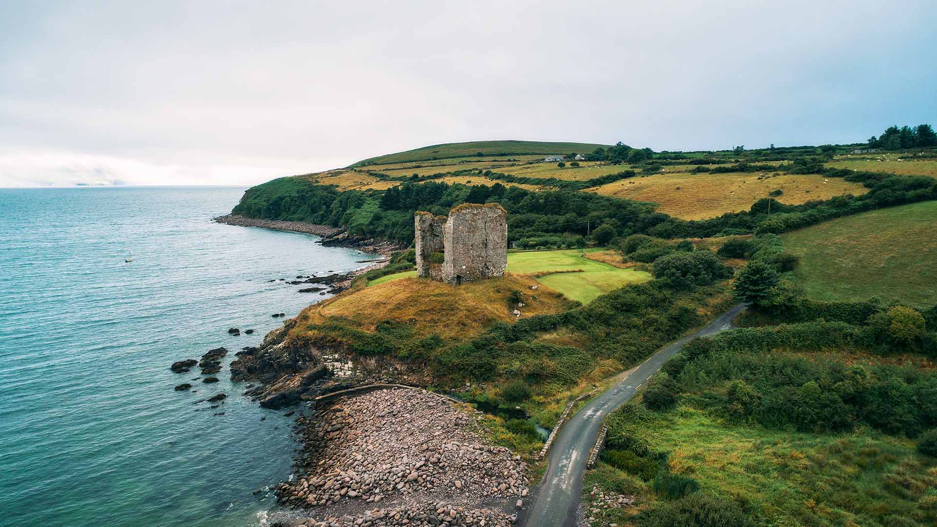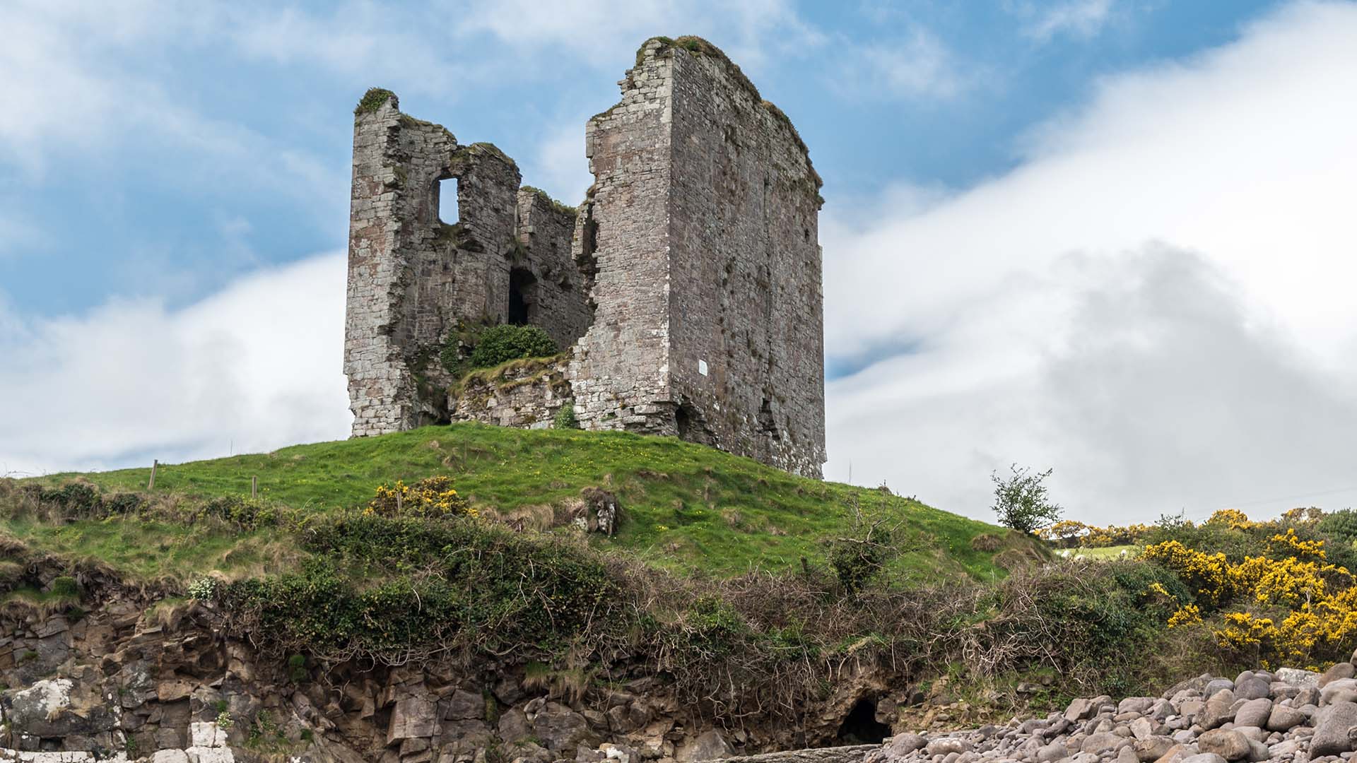 You won’t miss it from the road! The castle ruins consist of a large tower house that sits atop a small hill by the water. Both hill and castle offer lovely views over the Irish Sea.