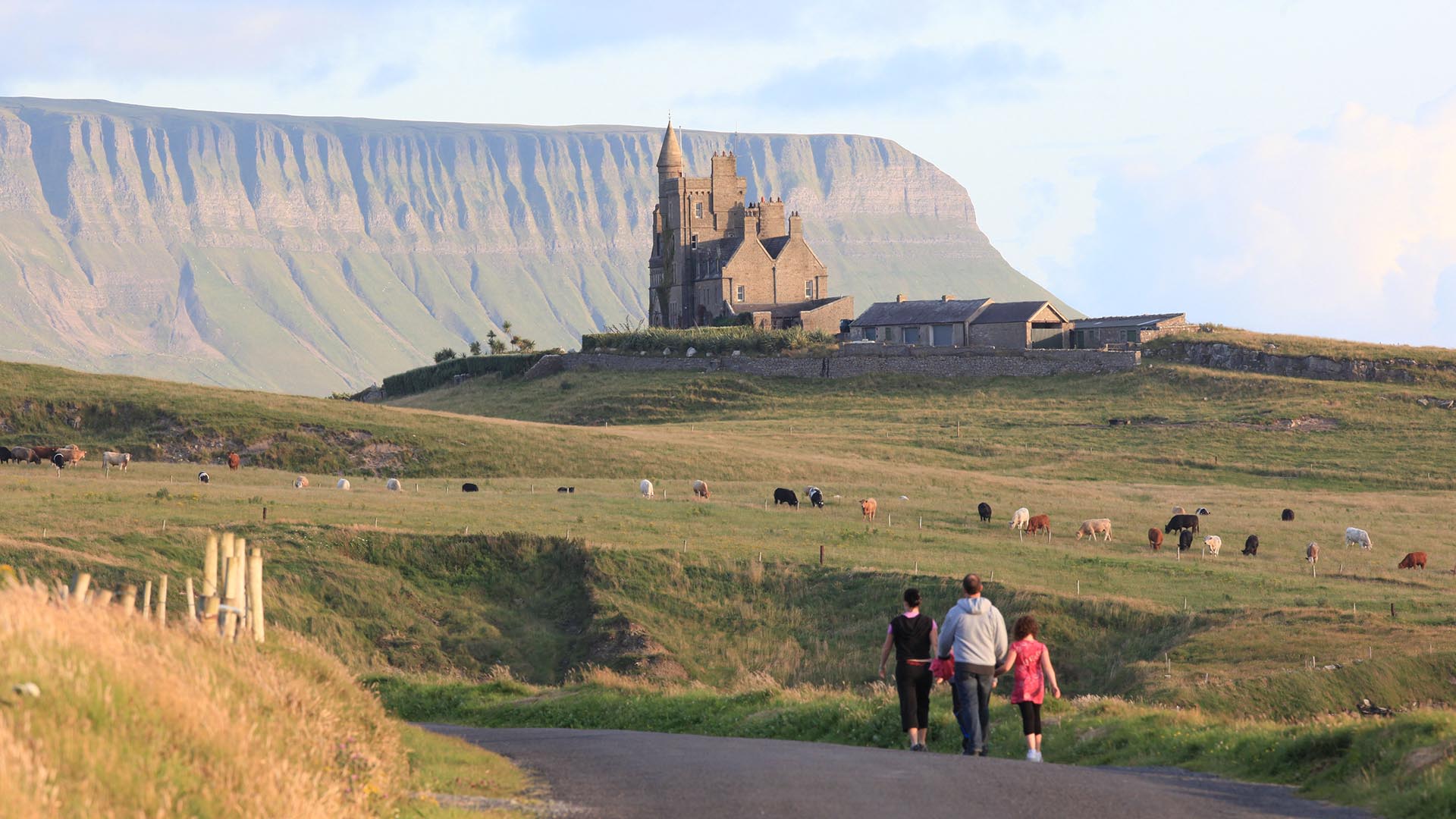 The skyline above is dominated by the nearby flat-topped mountain, Benbulben.