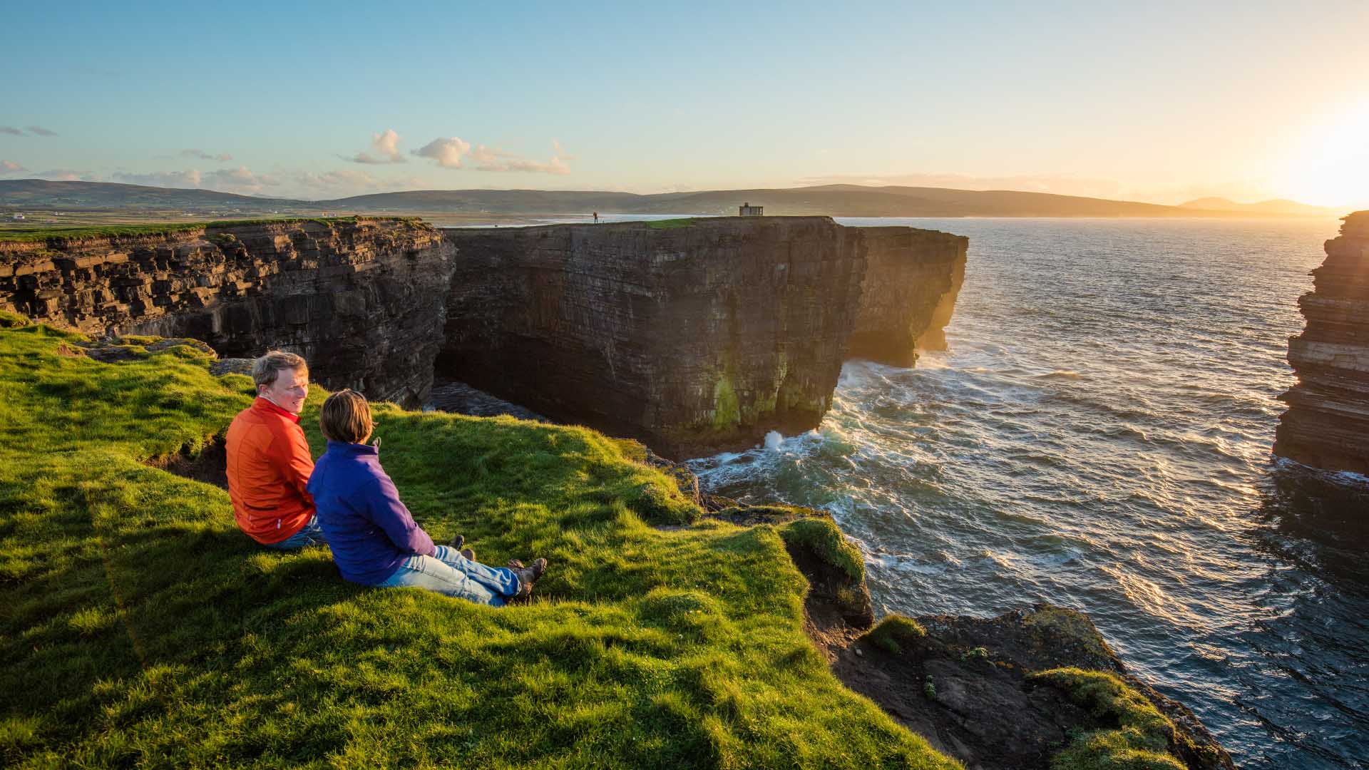 To admire the sweeping views over the coastline and sea, you can walk to the cliff by Downpatrick Head. From this spot, you can also admire the unique collection of islands known as the Staggs of Broadhaven. As there are no barriers, caution is advised.