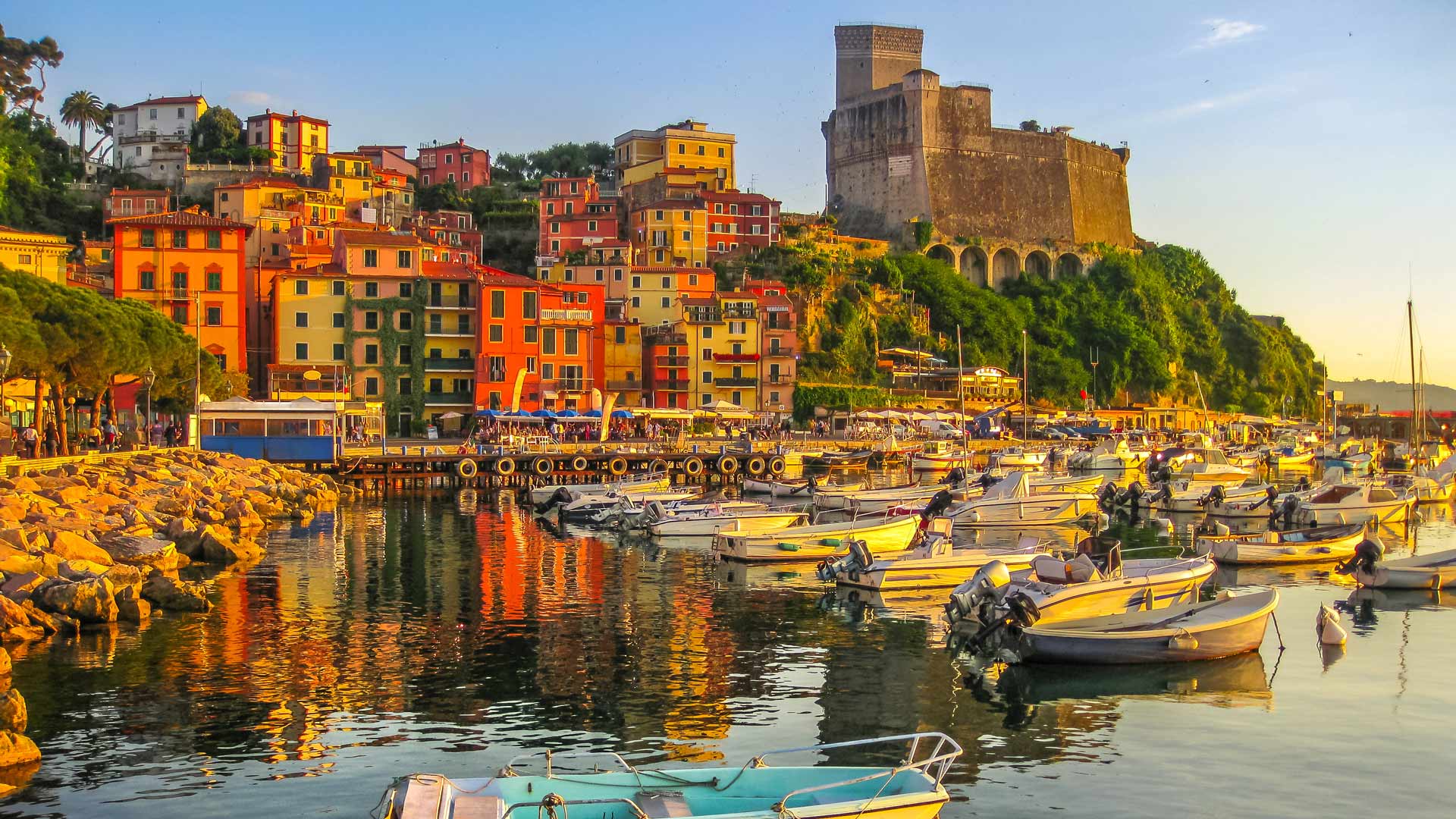 Today it’s a protected natural area. Pine forests sweep down to hidden coves. Walking trails trace the cliffs, offering views that shift with every turn. Islands rise from the water – Palmaria, Tino, Tinetto – each with its own character and history.
