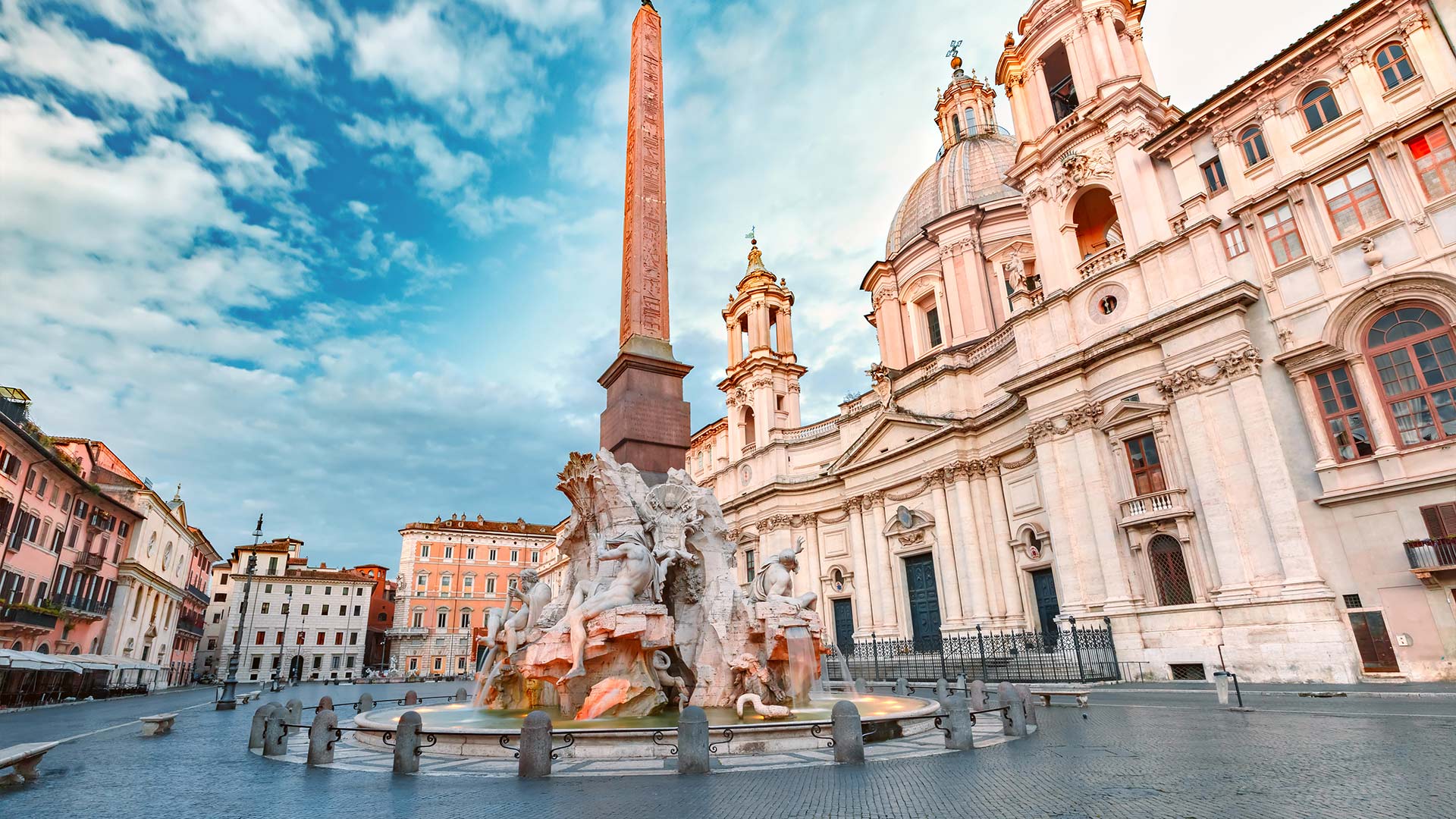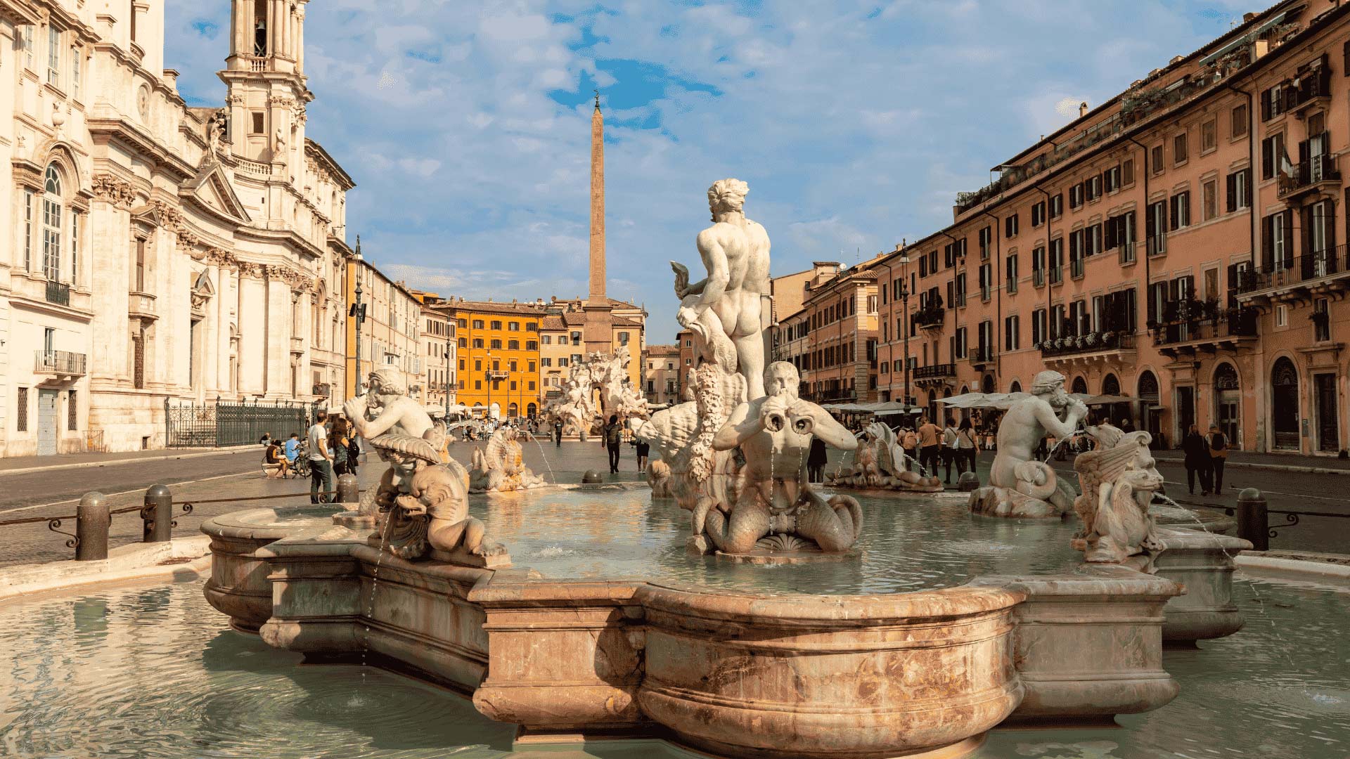 Bernini's Fountain of the Four Rivers commands the centre. Its marble gods represent the Nile, Ganges, Danube, and Rio de la Plata. Local legend says the Nile figure covers his face so he doesn’t have to see Borromini's church across the square. (Probably not true, but Romans love their artistic rivalries.)