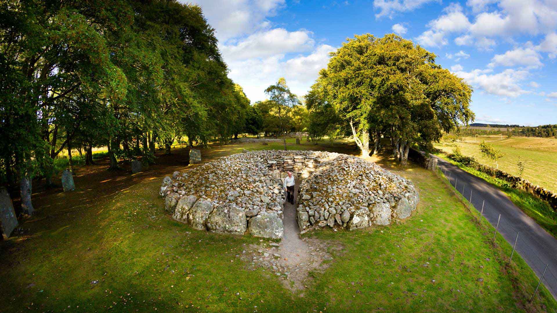 The Clava Cairns are a Bronze Age cemetery complex, including passage graves, ring cairns and standing stones that date back roughly 4,000 years. Located near Inverness on the River Nairn, this is one of Scotland’s most significant sacred prehistoric sites. The cairns are dominated by a line of three remarkably well-preserved burial cairns, each enclosed by stone circles, and little is known about the early builders but the alignment suggests that the sun may have been central to their beliefs.