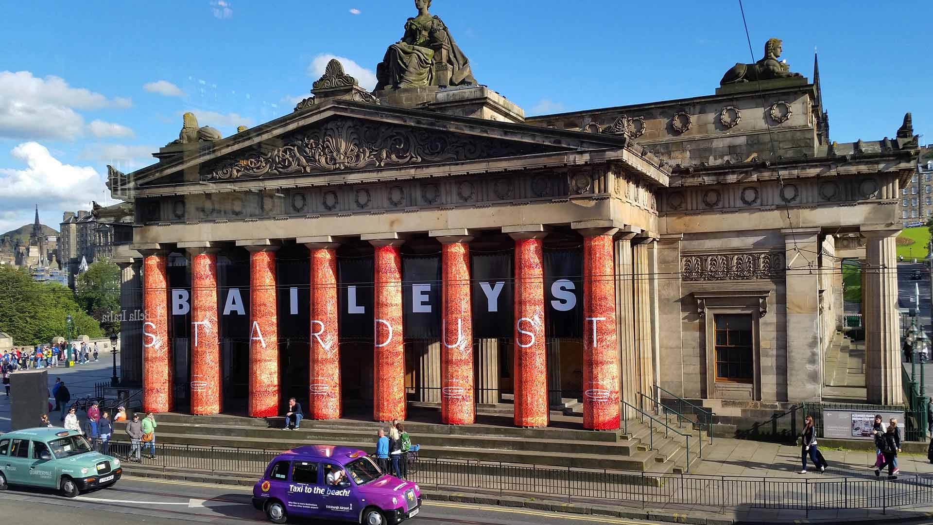 The National Gallery is located on a hill known as The Mound, between the Old Town and New Town of Edinburgh at the edge of Princes Street Gardens.