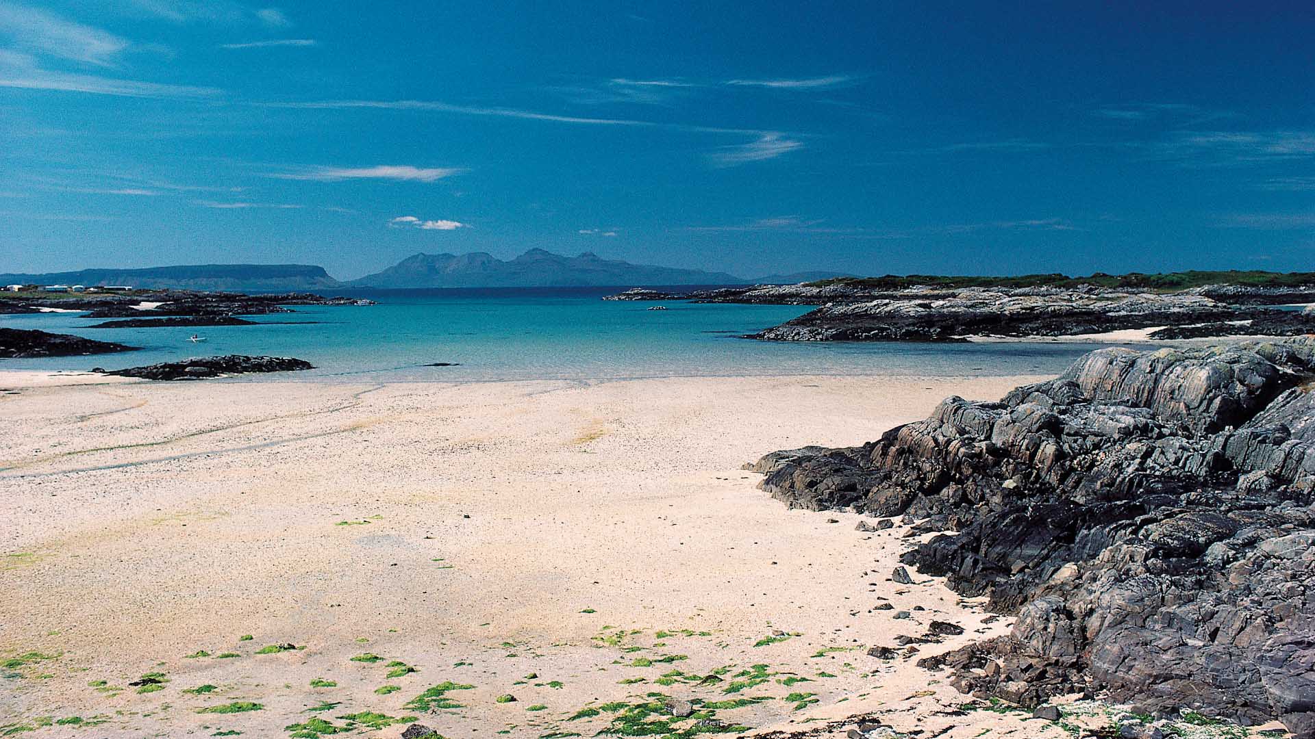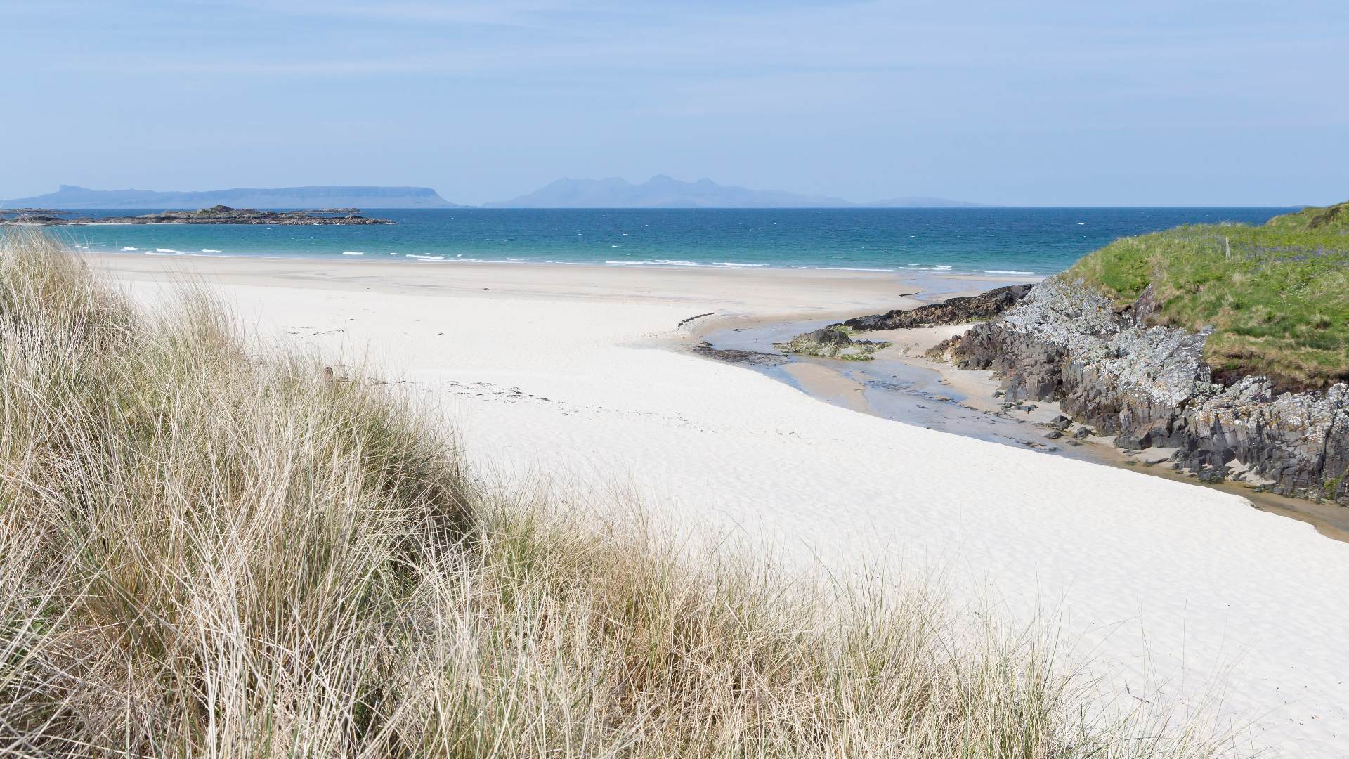 Just south of the estuary of River Morar, the beach is a spit of white sands and clear waters that also provide stunning views over the crest of Cuillin on the Isla of Skye, the peaks of Rum and the sea cliff at Eigg.